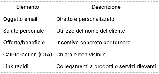 La chiarezza del messaggio è fondamentale. Evita testi lunghi e poco chiari. Scegli un oggetto incisivo e una call-to-action visibile. Comunica il valore che il cliente può ricevere tornando attivo. Ecco uno schema di elementi da includere: