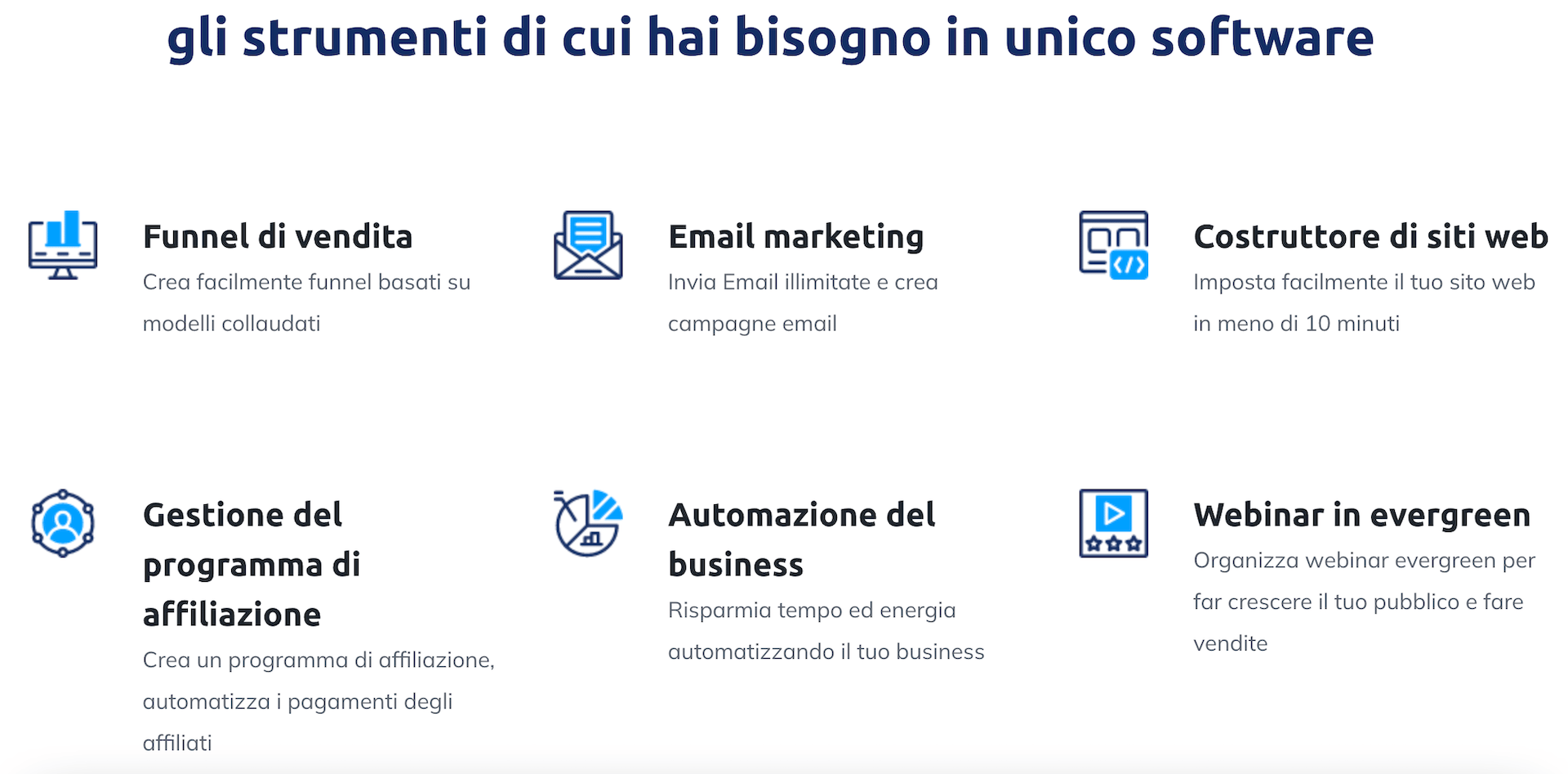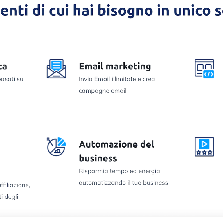 Questa piattaforma offre una gamma completa di strumenti integrati che semplificano il processo di gestione di blog, funnel di vendita, siti web, liste email e programmi di affiliazione e webinar.